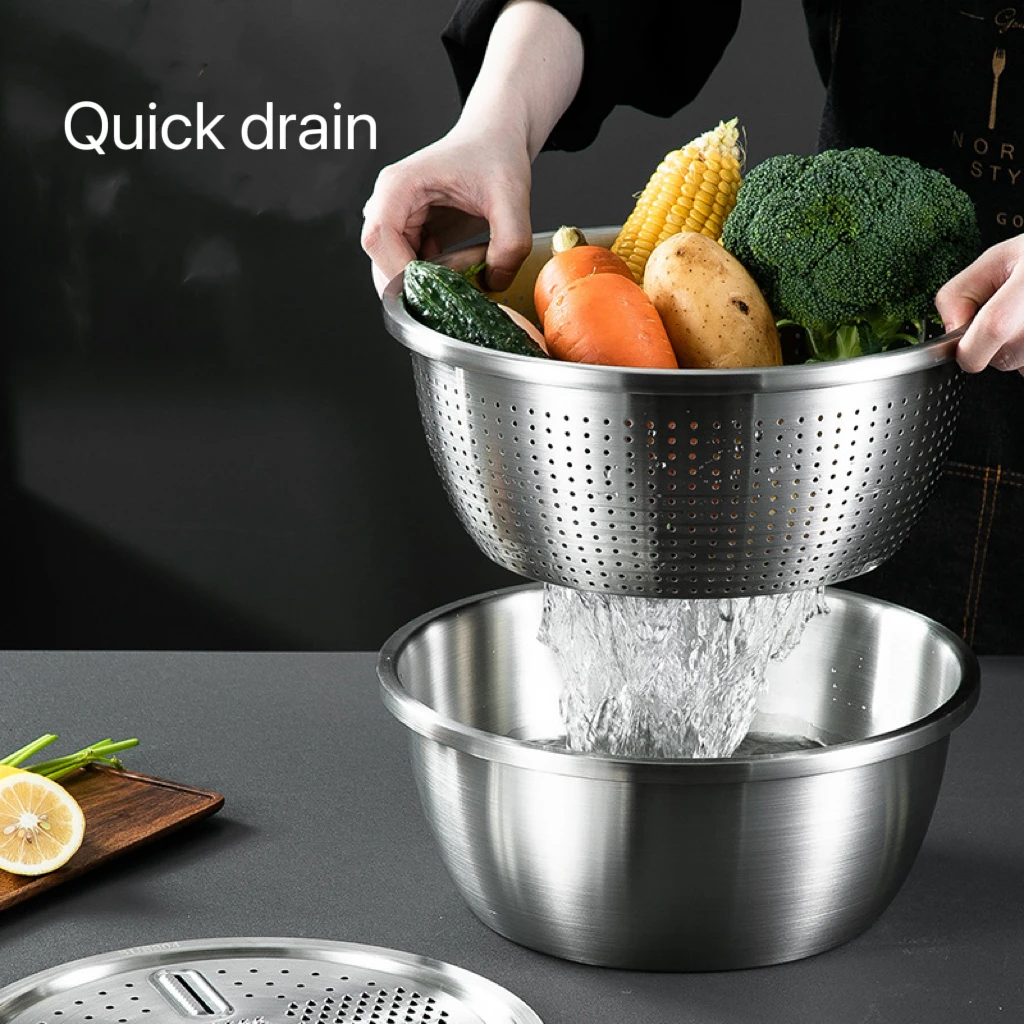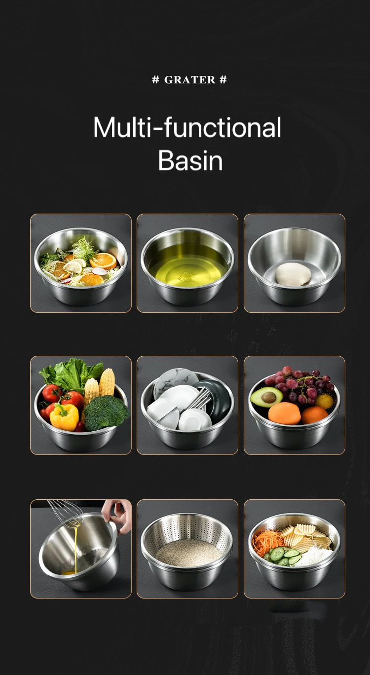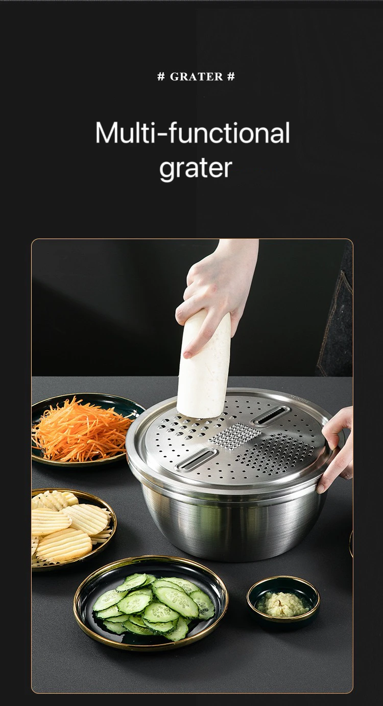 A multifunctional bowl grater with basin and filter is a versatile kitchen tool designed to make food preparation faster, cleaner, and more convenient. It typically features: